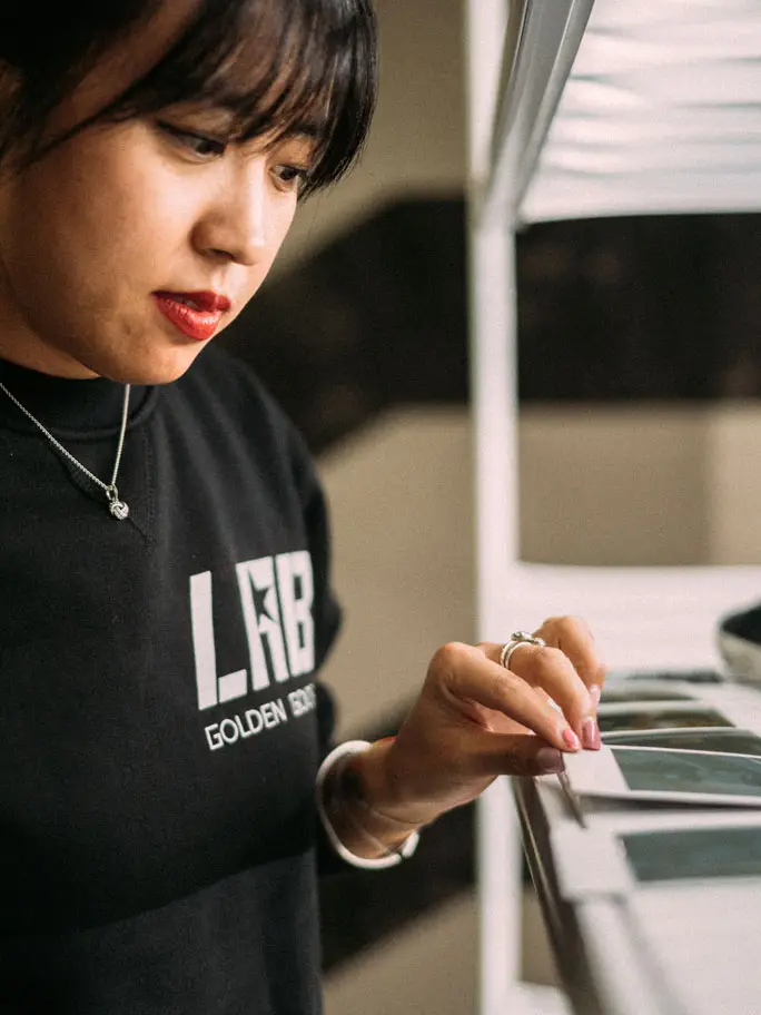 Il mio viaggio in Golden è stato davvero unico nel suo genere; mi sembra ancora il primo giorno, quando all'improvviso mi sono ritrovata su un aereo per Milano. L'energia che Golden ti dà, l'energia che respiri, è davvero unica. Lavoravo come gallerista prima di entrare a far parte del team di Sneakers Maker di Golden Goose APAC. Non avevo precedenti esperienze lavorative nel mondo del retail, ma a Golden non importava: erano interessati alla mia creatività, alla mia sensibilità quando si tratta di cogliere le diverse sfaccettature del mondo e tradurle in creazioni uniche.